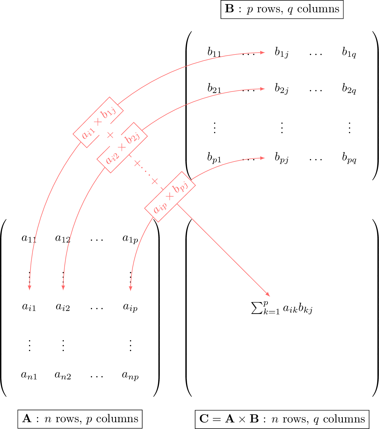 matrix product \(\mathbf{A}\times \mathbf{B}\) is a matrix \(\mathbf{C}\) of size \(n\times q\) where the entry \(c_{ij}\) is the dot product of the \(i\)-th row of \(\mathbf{A}\) and the \(j\)-th column of \(\mathbf{B}\):$$c_{ij}=\sum_{k=1}^p a_{ik}b_{kj}, \qquad 1 \leqslant i \leqslant n,\; 1 \leqslant j \leqslant q.$$