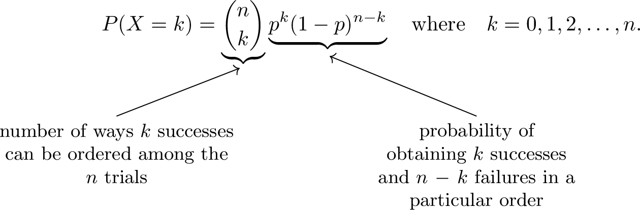 - \(\begin{aligned}[t] P(X = 2) &= P(X_1 = 1 \text{ and } X_2 = 1 \text{ and } X_3 = 0) + P(X_1 = 1 \text{ and } X_2 = 0 \text{ and } X_3 = 1) \\ &\quad + P(X_1 = 0 \text{ and } X_2 = 1 \text{ and } X_3 = 1) \\ &= p^2 (1-p) + p^2 (1-p) + p^2 (1-p) \\ &= 3 p^2 (1-p) \\ &= \binom{3}{2} p^2 (1-p)^1 \end{aligned}\)