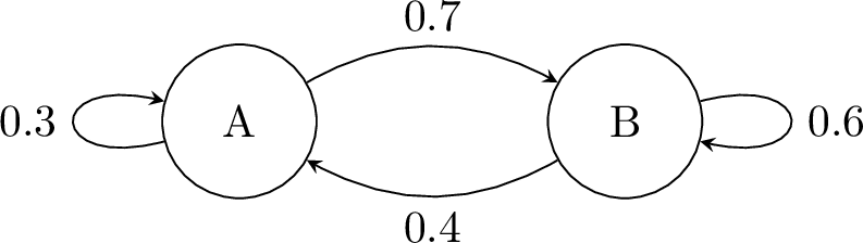 A laboratory rat is placed in a maze with two rooms, Room A and Room B. The transition diagram below shows the probability of the rat moving between rooms or staying in the same room every minute.