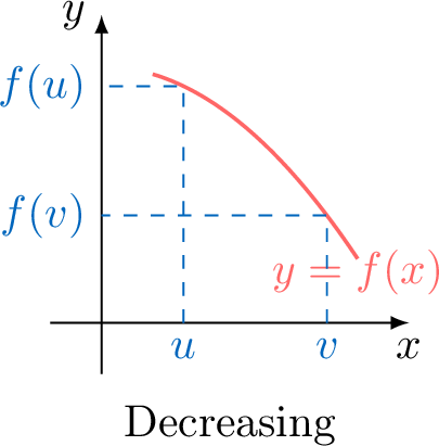 \(f\) is decreasing on \(I\) if for all \(u\) and \(v\) in \(I\): $$\text{if } u \leq v, \text{ then } f(u) \geq f(v)$$ A decreasing function reverses the order.