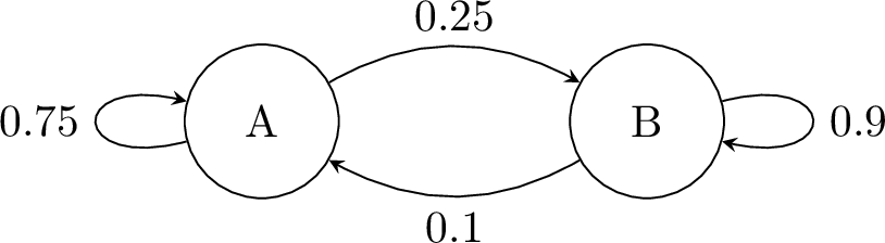 A system is composed of two states, \(A\) and \(B\). Its transitions are modeled by the following probabilistic graph: