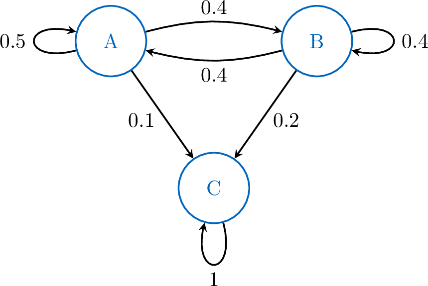 We consider a Markov chain \((X_n)\) with three states: \(A, B,\) and \(C\). The transition probabilities are modeled by the probabilistic graph below. The system starts in state \(A\), so \(\pi_0 = \begin{pmatrix} 1 & 0 & 0 \end{pmatrix}\).