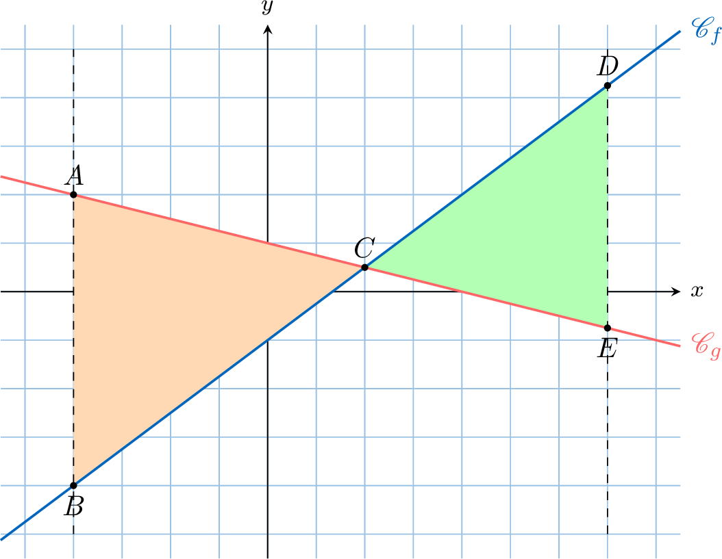 Consider two functions \(f\) and \(g\) defined on \(\mathbb{R}\) by:$$ f(x) = \dfrac{3}{4}x - 1 \quad \text{and} \quad g(x) = -\dfrac{1}{4}x + 1 $$The curves \(\mathscr{C}_f\) and \(\mathscr{C}_g\) are shown below, intersecting at point \(C(2, 0.5)\). Two regions are shaded: triangle \(ABC\) (orange) and triangle \(CDE\) (green).