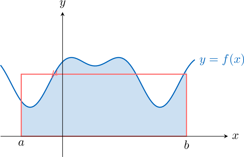 In the case where \(f\) is positive on \([a, b]\), the equality \(\displaystyle \int_{a}^{b} f(x) \,dx = \mu(b - a)\) indicates that the area of the domain under the graph of \(f\) is equal to the area of the rectangle with dimensions \(\mu\) and \(b - a\).