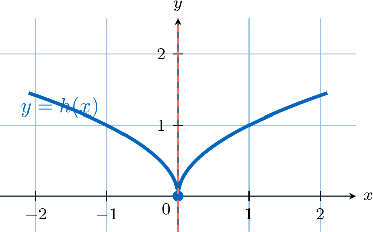 The graph below shows a function \(h\) that is continuous on \([-2, 2]\) but not differentiable at \(x=0\).