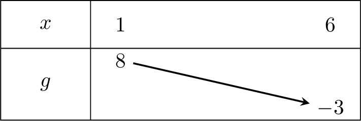 The table of variation for a continuous function \(g\) on the interval \([1, 6]\) is given below: