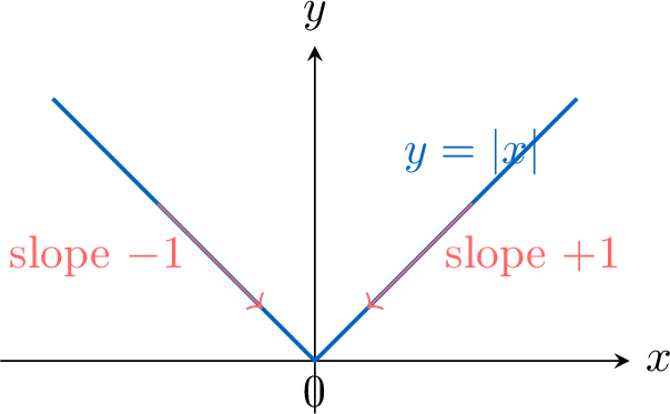 - It is not differentiable at 0 because the slope on the left is \(-1\) and the slope on the right is \(+1\).
