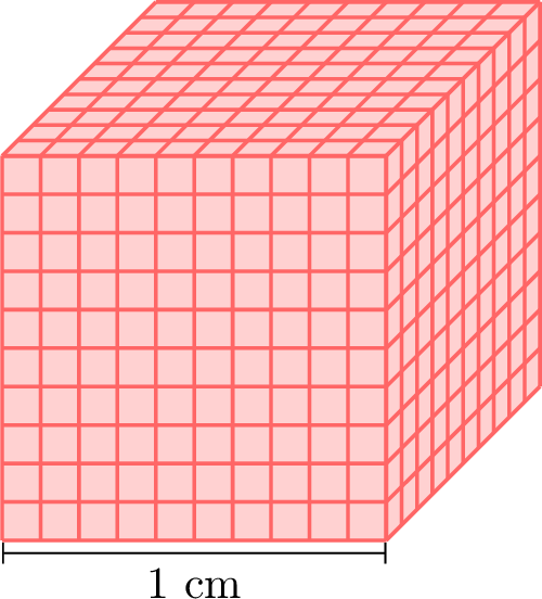 1 \(\mathrm{cm}^3\). Since \(1 \,\text{cm} = 10 \,\text{mm}\), each side of this cube is \(10 \,\text{mm}\) long.