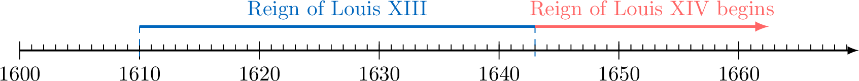 This timeline shows the reigns of two famous kings of France. The bar shows the duration of Louis XIII’s reign, and the arrow shows when Louis XIV’s reign begins.