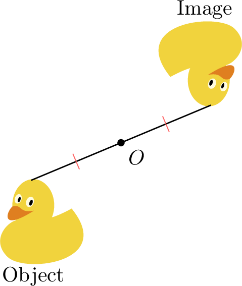 The point reflection of an object in a point \(O\) is obtained by taking the point reflection in \(O\) of all its points. The image has the same size and shape as the object, but it is turned \(180^\circ\) around \(O\).