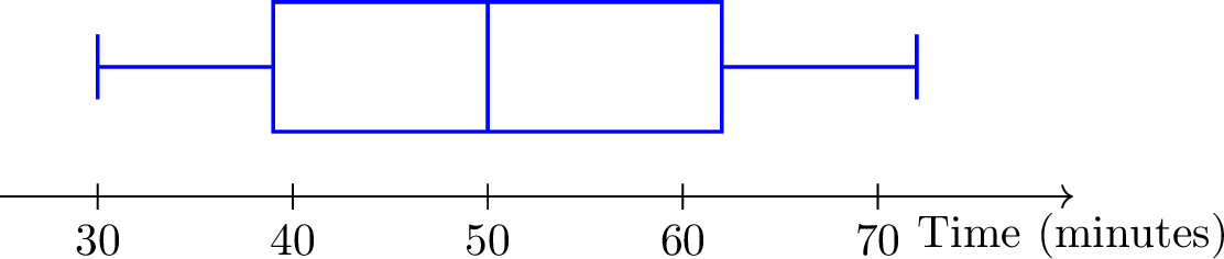 This box plot shows the number of minutes passengers spent waiting in an airport lounge.