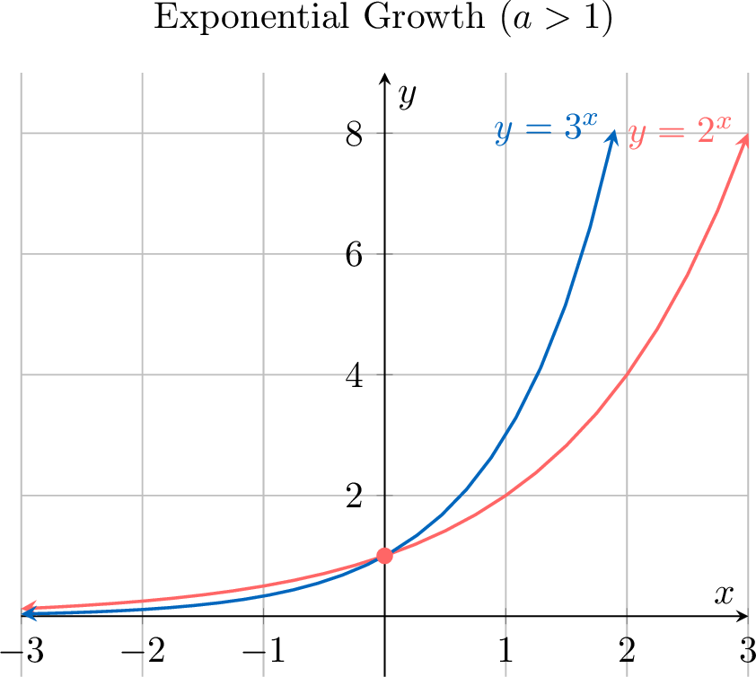 exponential.$$\begin{aligned}x: &\ 0\ & \textcolor{colordef}{\xrightarrow{\;+1\;}} &\ 1\ & \textcolor{colordef}{\xrightarrow{\;+1\;}} &\ 2\ & \textcolor{colordef}{\xrightarrow{\;+1\;}} &\ 3 \\