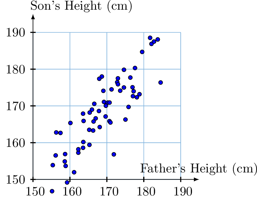 A researcher explores if sons of taller fathers tend to be taller. The scatter plot shows the relationship between fathers’ heights and their sons’ heights.