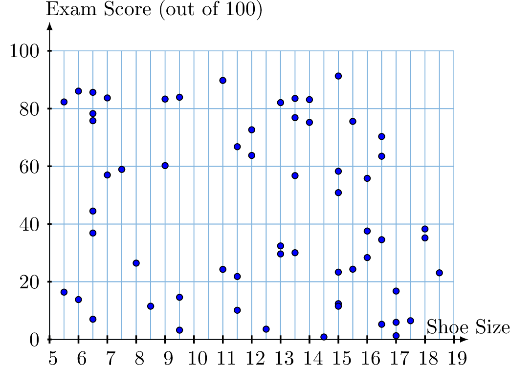 A researcher investigates whether a student’s shoe size relates to their exam score.