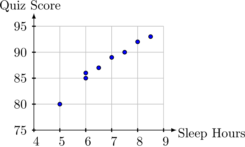 Lisa recorded her hours of sleep and quiz scores over 8 days.