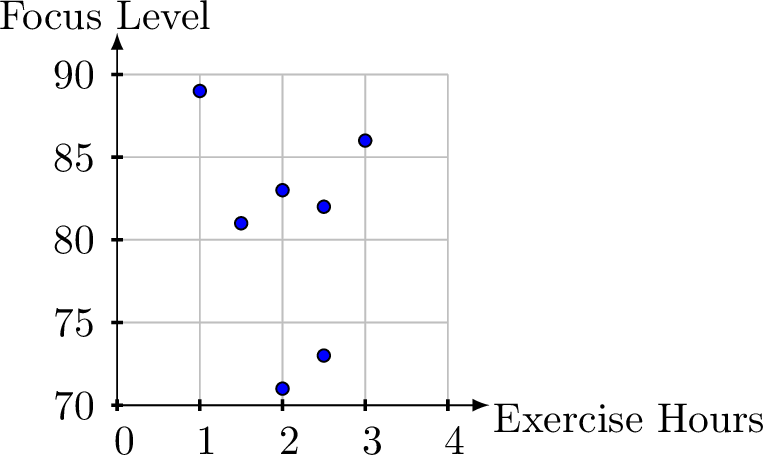 Anna investigated if exercise impacts her mental focus, recording daily exercise hours and a focus score (out of 100).