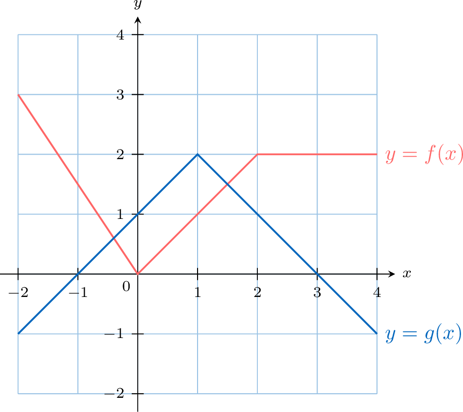 The graphs of two functions, \(f\) and \(g\), are shown below.