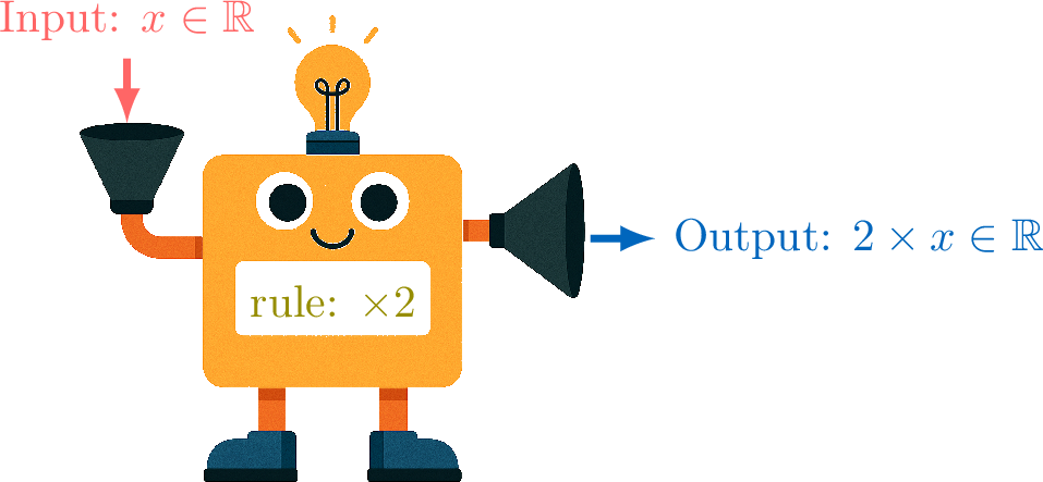 In general we write $$\Function{\textcolor{olive}{f}}{\textcolor{colordef}{X}}{\textcolor{colorprop}{Y}}{\textcolor{colordef}{x}}{\textcolor{colorprop}{f(x)}}$$For example, if the rule is "twice the input" and we are mapping real numbers to real numbers, \(f: \mathbb{R} \to \mathbb{R}\):