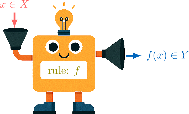 In general we write $$\Function{\textcolor{olive}{f}}{\textcolor{colordef}{X}}{\textcolor{colorprop}{Y}}{\textcolor{colordef}{x}}{\textcolor{colorprop}{f(x)}}$$For example, if the rule is "twice the input" and we are mapping real numbers to real numbers, \(f: \mathbb{R} \to \mathbb{R}\):