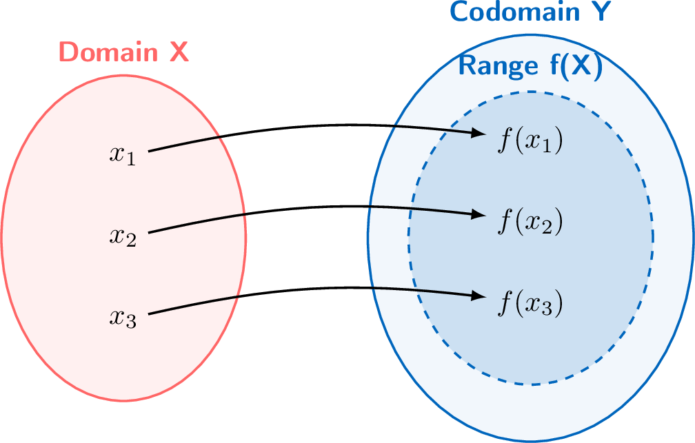 codomain \(Y\). This is written as \(f: X \to Y\). The specific rule that maps an individual element \(x\) from the domain to an element \(f(x)\) in the codomain is written as \(x \mapsto f(x)\).