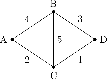 Using Kruskal's algorithm or Prim's algorithm, find the total weight of the Minimum Spanning Tree (MST).