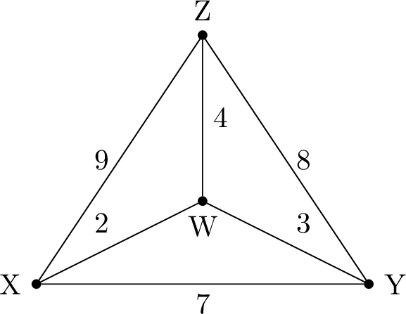 Using Kruskal's algorithm or Prim's algorithm, find the total weight of the Minimum Spanning Tree (MST).