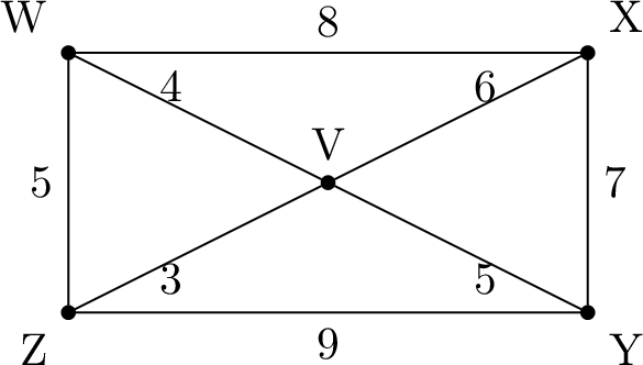 A network administrator wants to find the shortest loop to check 5 servers arranged in a star topology with a ring connection. The graph below shows the latency (ms). The central server is \(V\).