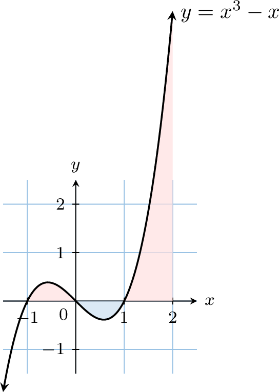 Find the total area of the region enclosed by the x-axis and the curve \(y=x^3-x\) from \(x=-1\) to \(x=2\).