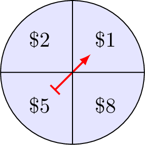 The player wins the amount of money indicated by the arrow, but it costs \(\dollar 5\) to play each game. In gambling, the gain is defined as the payout minus the cost to play.