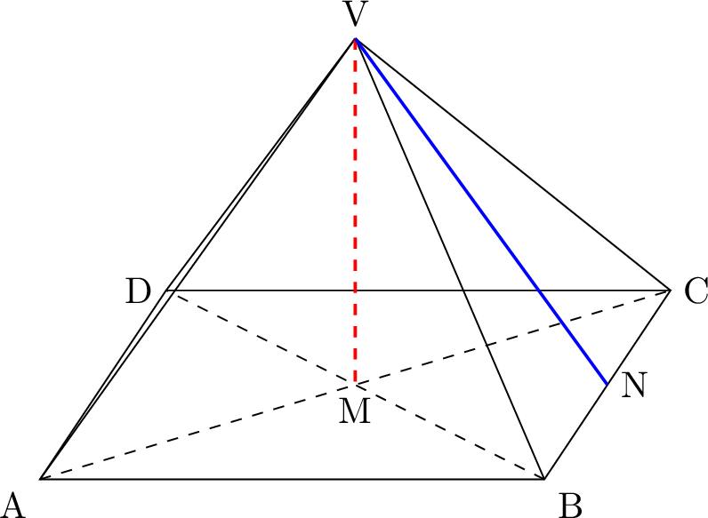 The exact length of the slant height \(VN\) of the triangular face \(VBC\).