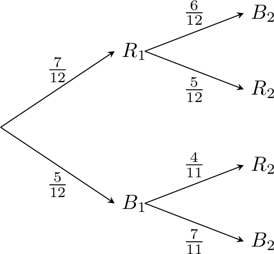 A bag contains 5 red (R) and 7 blue (B) marbles. One marble is drawn and not replaced, and then a second marble is drawn.