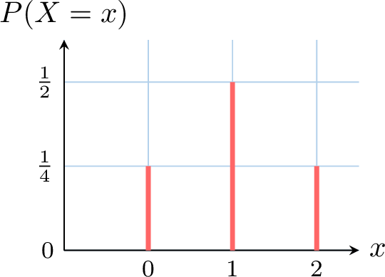 - \(\begin{aligned}[t] P(X = 2) &= P(X_1 = 1 \text{ and } X_2 = 1 \text{ and } X_3 = 0) + P(X_1 = 1 \text{ and } X_2 = 0 \text{ and } X_3 = 1) \\ &\quad + P(X_1 = 0 \text{ and } X_2 = 1 \text{ and } X_3 = 1) \\ &= p^2 (1-p) + p^2 (1-p) + p^2 (1-p) \\ &= 3 p^2 (1-p) \\ &= \binom{3}{2} p^2 (1-p)^1 \end{aligned}\)