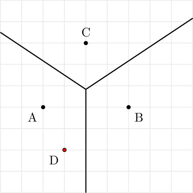 Site \(D\) is to be added to the Voronoi diagram shown below for sites \(A\), \(B\), and \(C\).
