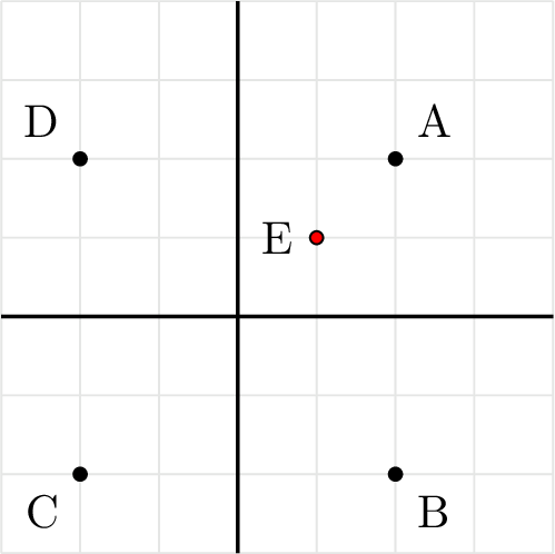 Site \(E\) is to be added to the Voronoi diagram shown below for sites \(A\), \(B\), \(C\), and \(D\).