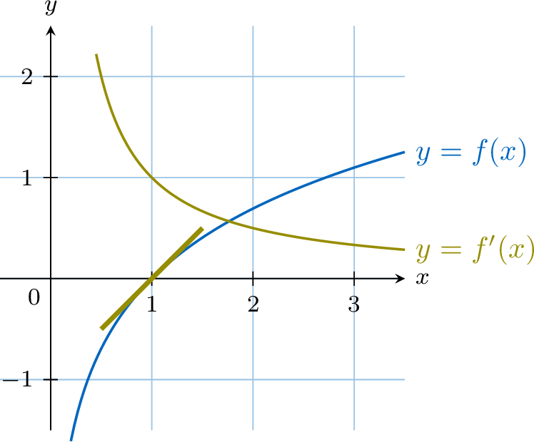 The graphs of a function \(f(x)\) and its derivative function \(f'(x)\) are shown below.