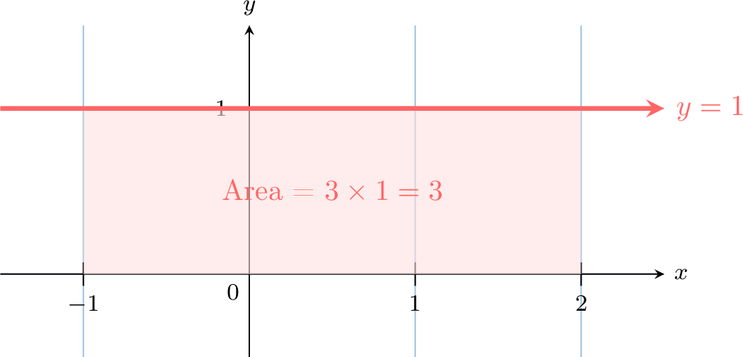 Therefore, \(\displaystyle\int_{-1}^{2}1\,\mathrm dx= 3.\)