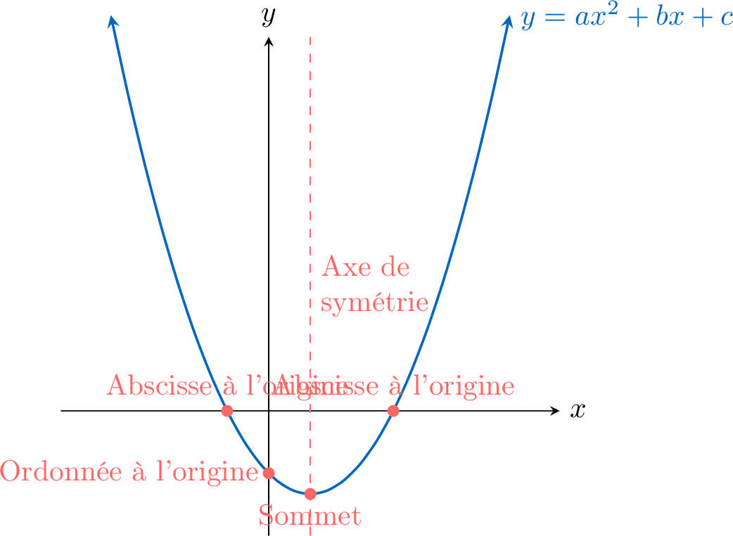 • Axe de symétrie : Une droite verticale qui divise la parabole en deux images miroirs. Son équation est \(x = -\frac{b}{2a}\).