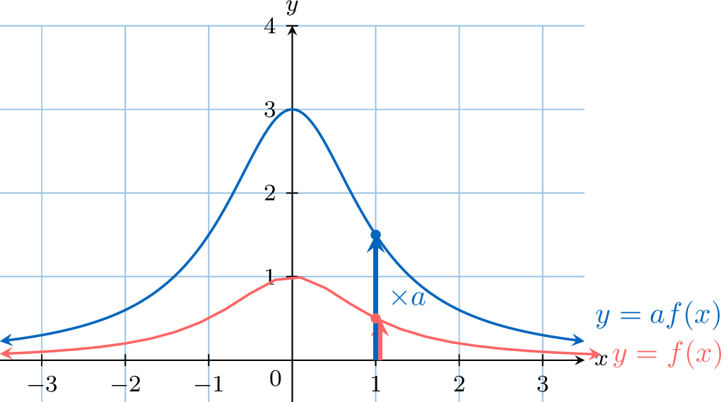 Une dilatation verticale étire ou comprime verticalement le graphe d'une fonction. Elle est définie par :$$g(x) = a \cdot f(x)$$Cette transformation associe un point \((x, y)\) à \((x, ay)\).