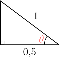 On connaît la longueur du côté adjacent (\(AB = 0{,}5\)) et celle de l’hypoténuse (\(BC = 1\)) par rapport à \(\theta\). On utilise la fonction cosinus inverse :$$\begin{aligned}\theta &= \cos^{-1}\left(\frac{\text{ADJ}}{\text{HYP}}\right) \\ &= \cos^{-1}\left(\frac{0{,}5}{1}\right) \\ &= 60^\circ.\end{aligned}$$
