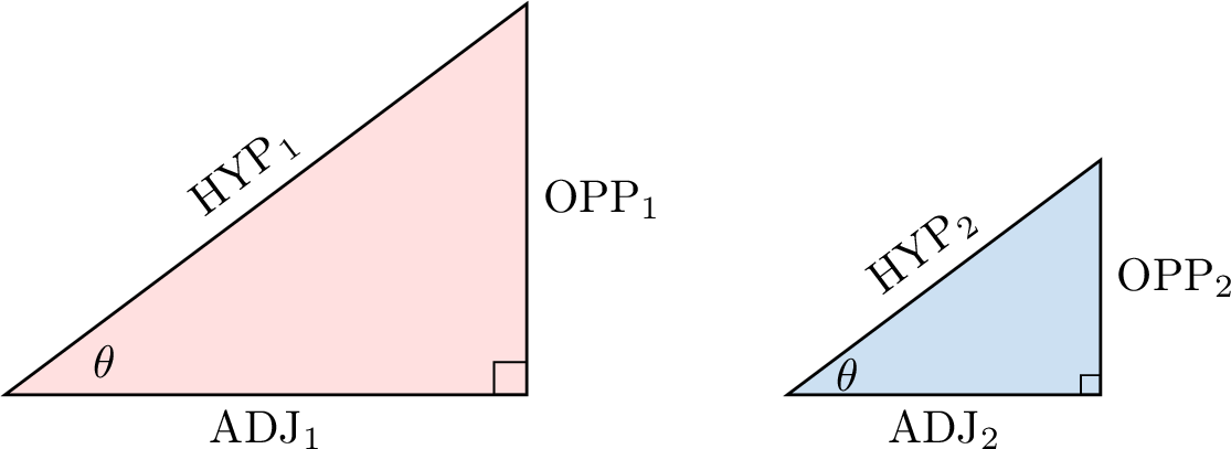 Une propriété fondamentale des triangles similaires est que les rapports de leurs côtés correspondants sont égaux. Cela signifie que, pour n’importe quel triangle rectangle avec l’angle \(\theta\) :$$ \frac{\text{OPP}_1}{\text{HYP}_1} = \frac{\text{OPP}_2}{\text{HYP}_2}, \quad \frac{\text{ADJ}_1}{\text{HYP}_1} = \frac{\text{ADJ}_2}{\text{HYP}_2}, \quad \frac{\text{OPP}_1}{\text{ADJ}_1} = \frac{\text{OPP}_2}{\text{ADJ}_2}. $$Puisque ces rapports sont constants pour un angle \(\theta\) donné, quelle que soit la taille du triangle, nous pouvons leur donner des noms spéciaux. Ce sont les rapports trigonométriques.