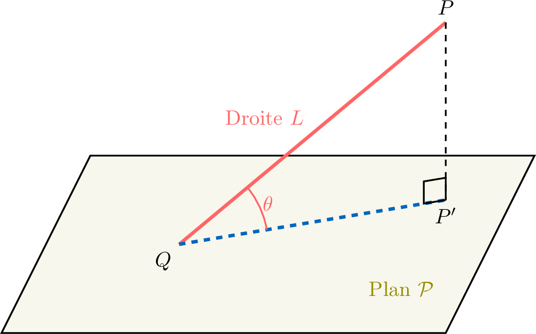 Dans le diagramme, l'angle entre la droite \(L\) et le plan \(\mathcal{P}\) est l'angle aigu \(\theta\) en \(Q\).