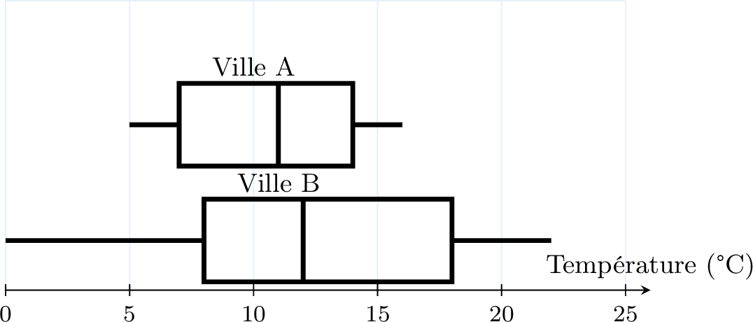 Ces diagrammes en boîte montrent les températures quotidiennes (°C) dans la Ville A et la Ville B.