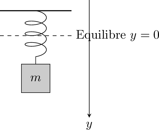 Une masse \(m\) est attachée à un ressort vertical. Selon la loi de Hooke et la deuxième loi de Newton, son déplacement \(y(t)\) par rapport à la position d'équilibre est régi par l'équation différentielle du second ordre :$$m\frac{d^2 y}{dt^2} = -ky$$où \(k\) est la constante de raideur positive du ressort. Cela décrit un Mouvement Harmonique Simple.