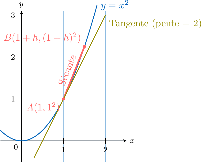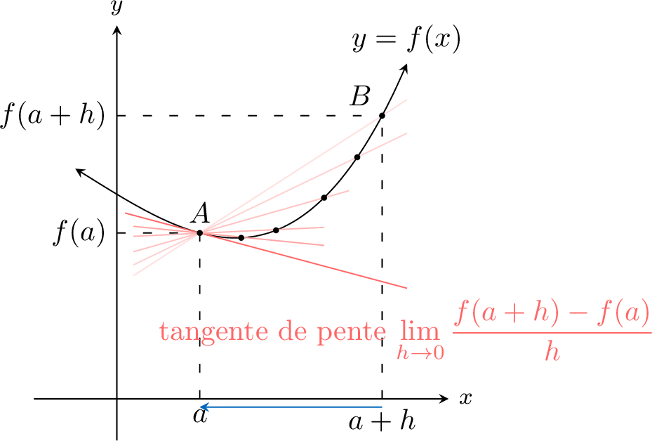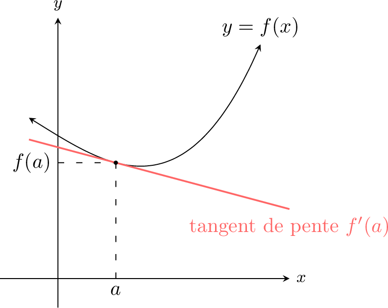 taux de variation instantané de la fonction en ce point. Le processus de recherche d'une dérivée est appelé la dérivation. Géométriquement, la dérivée en un point est la pente de la tangente à la courbe de la fonction en ce point.