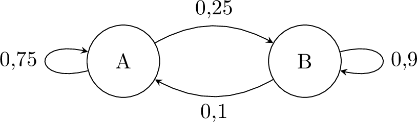 Un système est composé de deux états, \(A\) et \(B\). Ses transitions sont modélisées par le graphe probabiliste suivant :