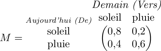 Une suite de variables aléatoires \((X_n)_{n \in \mathbb{N}}\) à valeurs dans \(E\) est une chaîne de Markov si, pour tout \(n \in \mathbb{N}\), pour tous indices \(i,j \in \{1,\dots,k\}\), et pour tous indices \(i_0,\dots,i_{n-1} \in \{1,\dots,k\}\) tels que l'événement de conditionnement soit de probabilité non nulle,$$P\!\Bigl(X_{n+1}=e_j \,\Big|\, X_n=e_i,\; X_{n-1}=e_{i_{n-1}},\dots,\; X_0=e_{i_0}\Bigr)=P\!\Bigl(X_{n+1}=e_j \,\Big|\, X_n=e_i\Bigr).$$Dans ce chapitre, on se place dans le cas homogène, c'est-à-dire que la probabilité conditionnelle$$p_{ij}=P\!\bigl(X_{n+1}=e_j \mid X_n=e_i\bigr)$$ne dépend pas de \(n\). La valeur \(p_{ij} \in [0, 1]\) est la probabilité de transition de l'état \(e_i\) vers l'état \(e_j\).