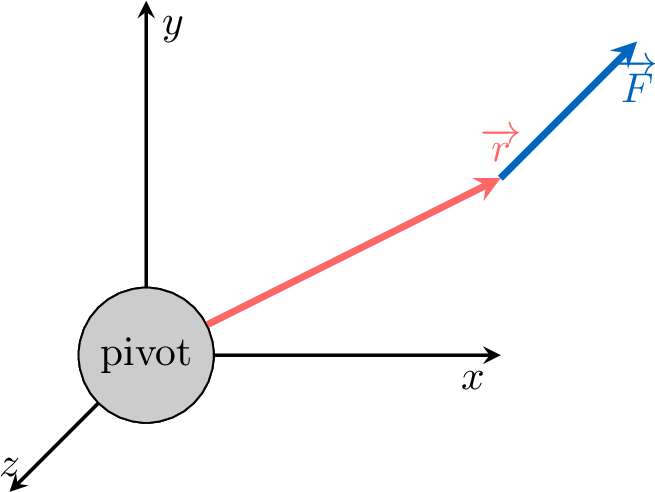 Le moment d'une force, \(\Vect{\tau}\), est une mesure de la capacité d'une force à faire tourner un objet. Le vecteur moment est calculé par le produit vectoriel du vecteur position \(\Vect{r}\) (de l'axe de rotation au point d'application de la force) et du vecteur force \(\Vect{F}\).$$ \Vect{\tau} = \Vect{r} \times \Vect{F} $$Une force de \(\Vect{F} = \begin{pmatrix} 0 \\ 0 \\ -10 \end{pmatrix}\) N est appliquée sur une clé à une position \(\Vect{r} = \begin{pmatrix} 0,2 \\ 0,1 \\ 0 \end{pmatrix}\) m par rapport au centre d'un pivot, comme illustré.