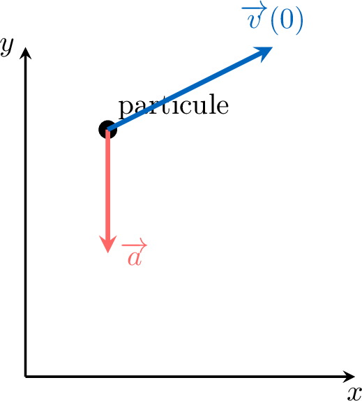 Une particule de masse \(m\) est lancée avec une vitesse initiale de \(\Vect{v}(0) = \begin{pmatrix} 20 \\ 30 \end{pmatrix}\) m/s. La seule force agissant sur elle est la gravité, ce qui résulte en une accélération constante de \(\Vect{a} = \begin{pmatrix} 0 \\ -9,8 \end{pmatrix}\) m/s².