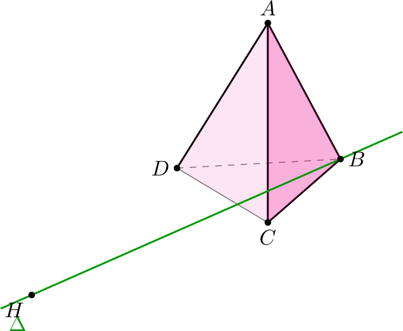 \(ABCD\) est un tétraèdre. On considère la droite \(\Delta(B, \Vect{BD} + 2\Vect{BC})\) et le point \(H\) tel que \(\Vect{BH} = \Vect{BD} + 2\Vect{BC}\).Pour chaque affirmation, dire si elle est vraie ou fausse ; justifier.