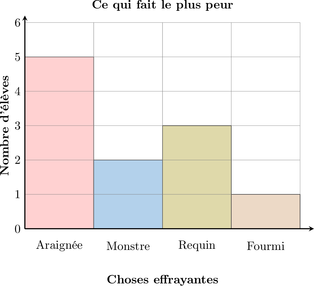 Hugo a demandé à sa classe : « De quoi as-tu le plus peur ? » Il a créé ce diagramme en bâtons pour montrer les résultats.